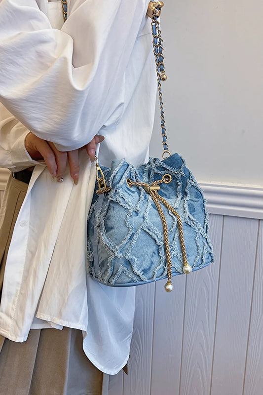 Chain Drawstring Raw Edge Denim Bucket Bag