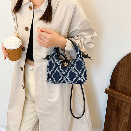 Checkered Raw Edge Denim Shoulder Bag